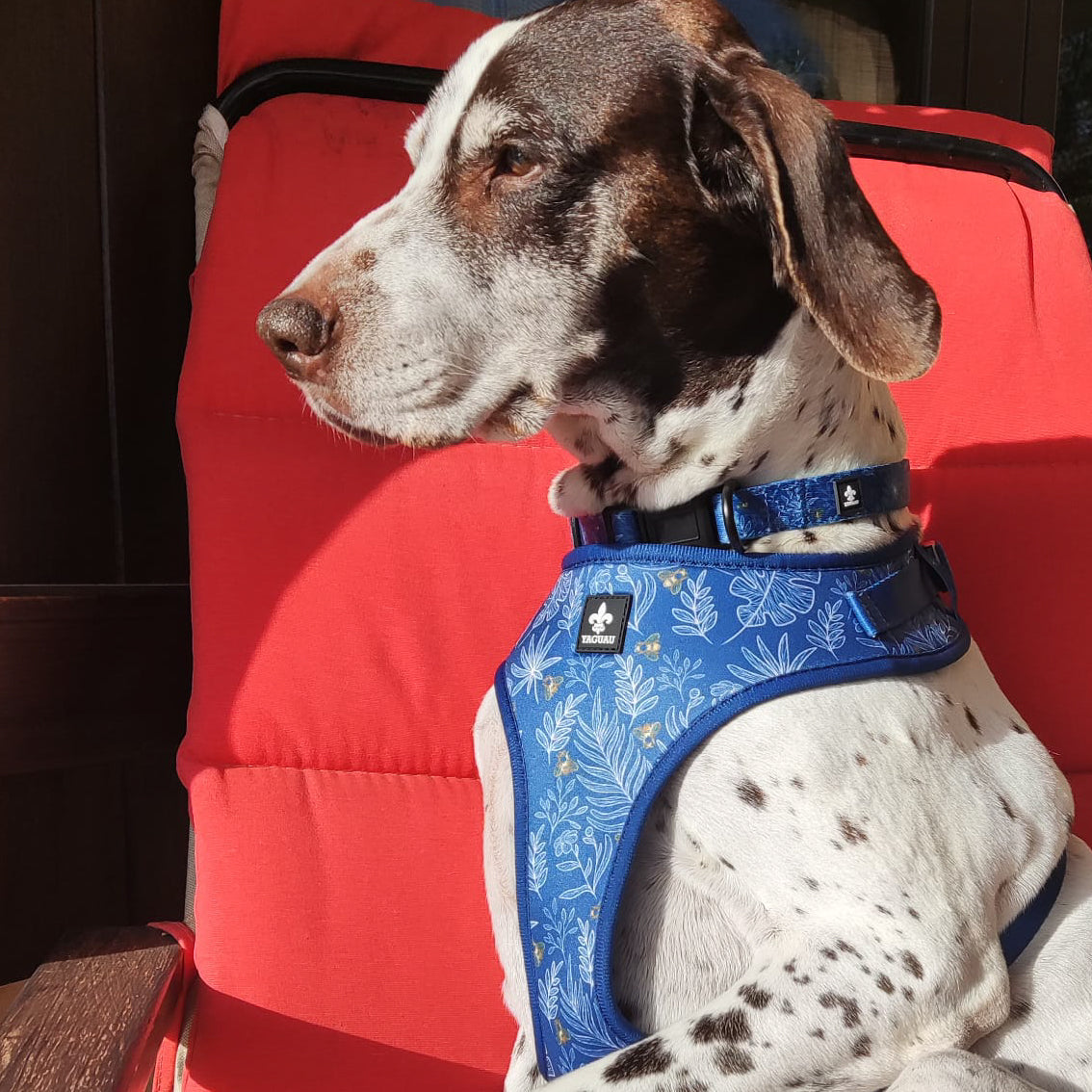 Un elegante patrón en azul y blanco con pequeños toques dorados en...